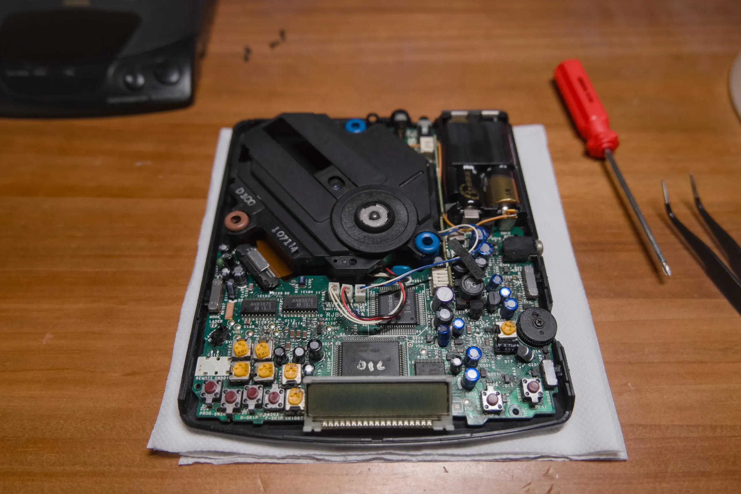 好在松下的较早期的CD机内部提供了许多电位器,便于我们调整光头参数。通过拆机,找到旁边写着TB也就是Track Balance的电位器,标记好初始位置然后顺时针或逆时针微调,每次转动少许然后暂时将外壳装上放入刻录碟,测试能否正常读取,重复这个过程直到切歌快进等功能都能顺利完成。我最终将电位器逆时针旋转了45度左右使其能够读取铼德Demo这张碟。然而哪怕我讲电位器转到头,也不能让机器很好的兼容威宝黑胶碟,表现为有时勉强能读取,有时出现周期性的破音。